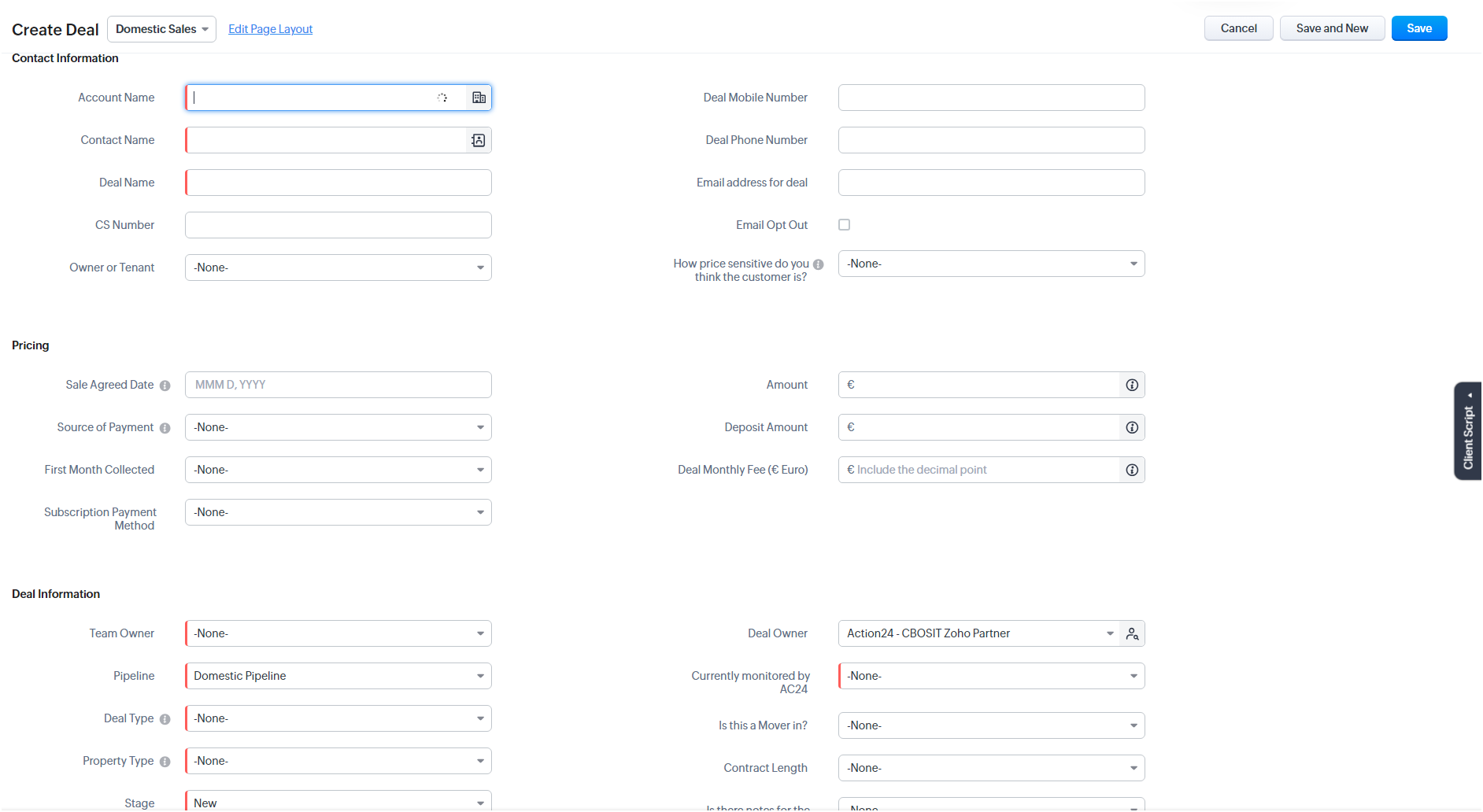 Click on the Deal module. Then, click on Create Deal. Select the appropriate account and contact.