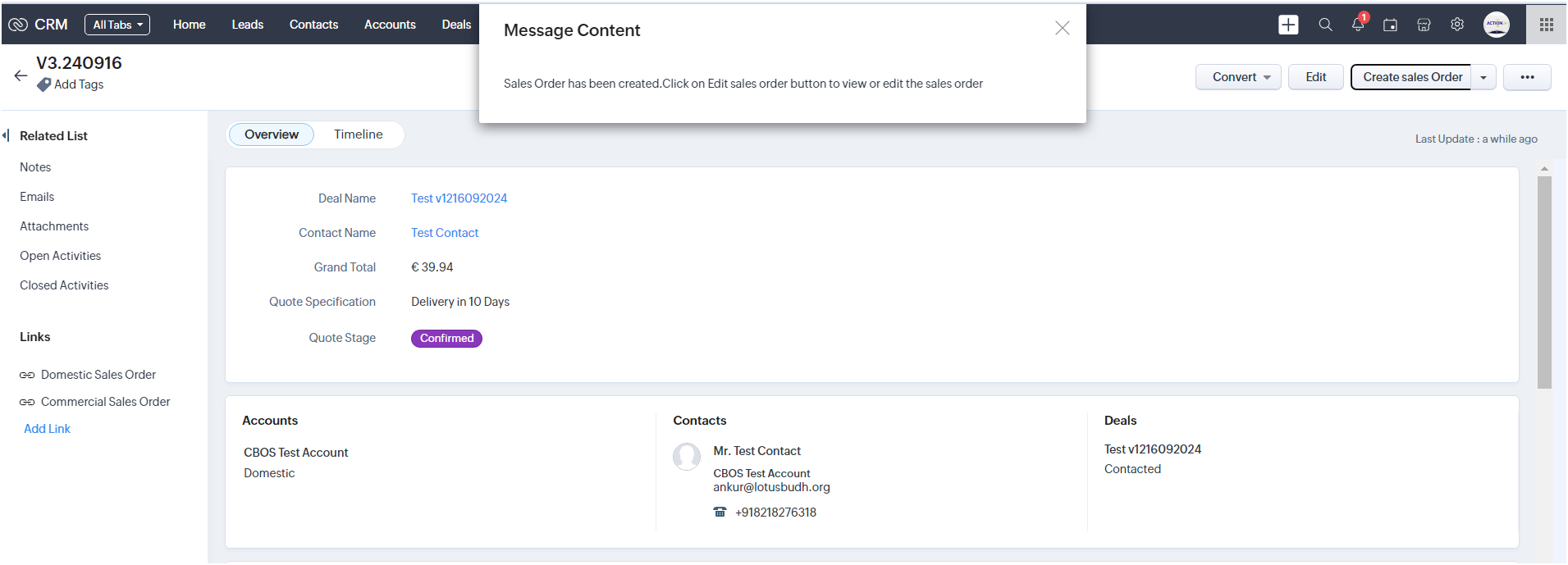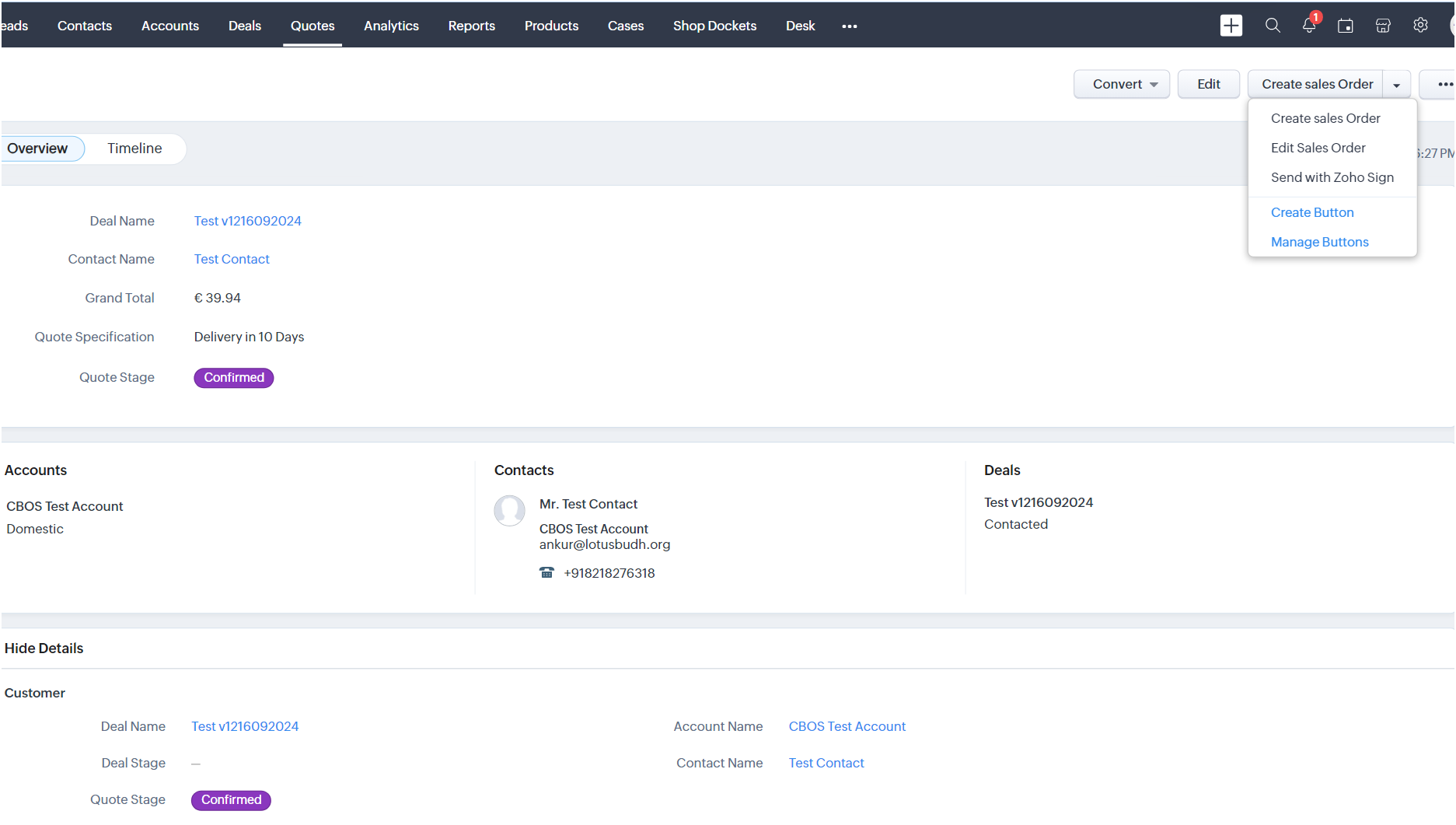 After receiving the success message, wait 2minutes for the sales order to be created in Zoho CRM and Books. Reason being Sales Order gets created in Zoho Books first to enable Inventory Management and then is transferred over to Zoho CRM under SO.