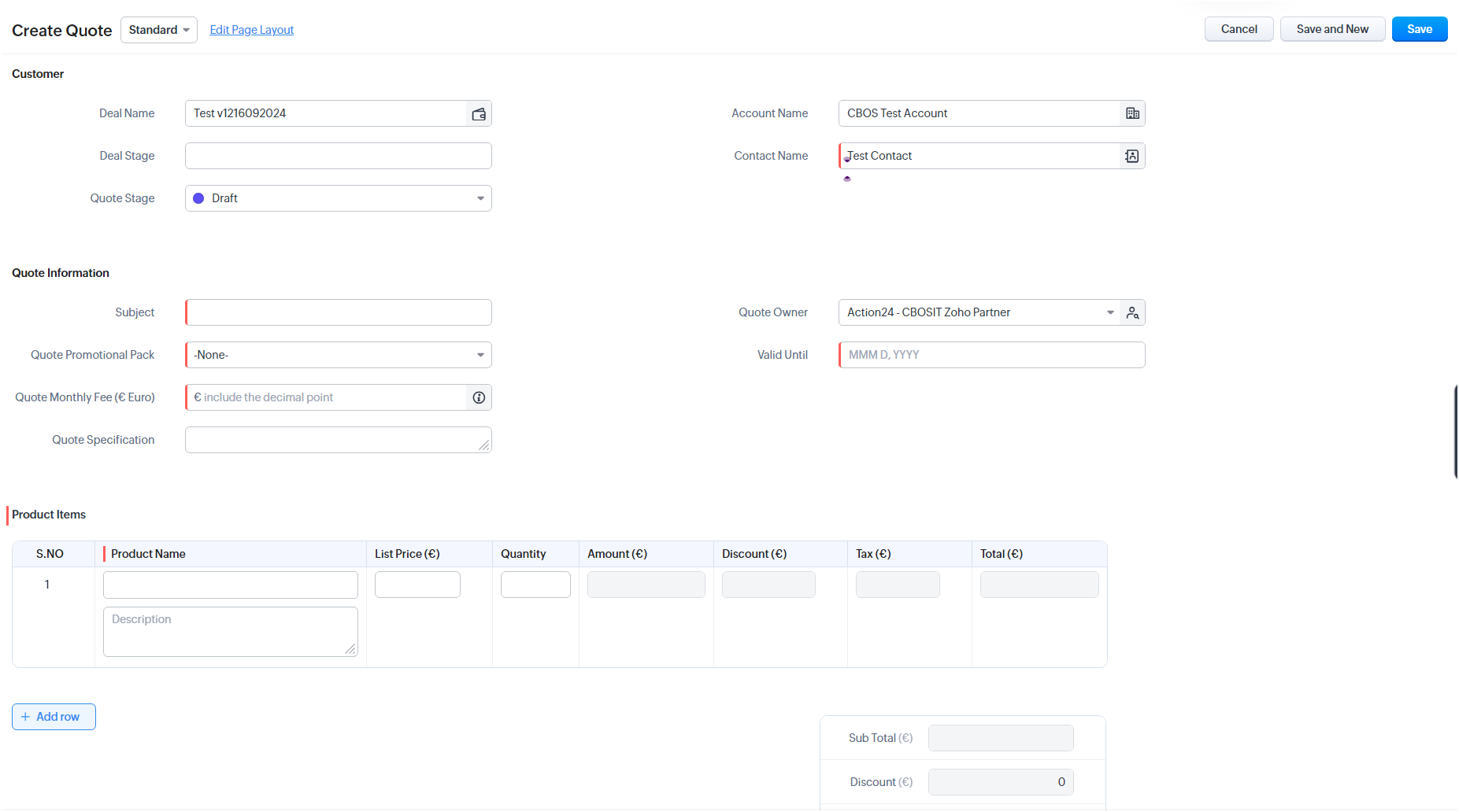 To create a quote, click on "Quotes" on the left-hand side and click the plus symbol. This will provide a screen where you can write the Quote subject and mandatory information.